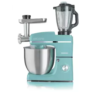 Комбайн також має ручку, що підсвічується, і функцію плавного пуску. До складу обладнання входять: чаша з нержавіючої сталі, скляний кувшин ємністю 1,5 л, гак для замішування тіста, міксер для легкого тіста, вінчик для збивання, м'ясорубка, 3 сита для м'ясорубки, насадка для приготування ковбасок, насадка для приготування печива, насадка для кебаб. -
